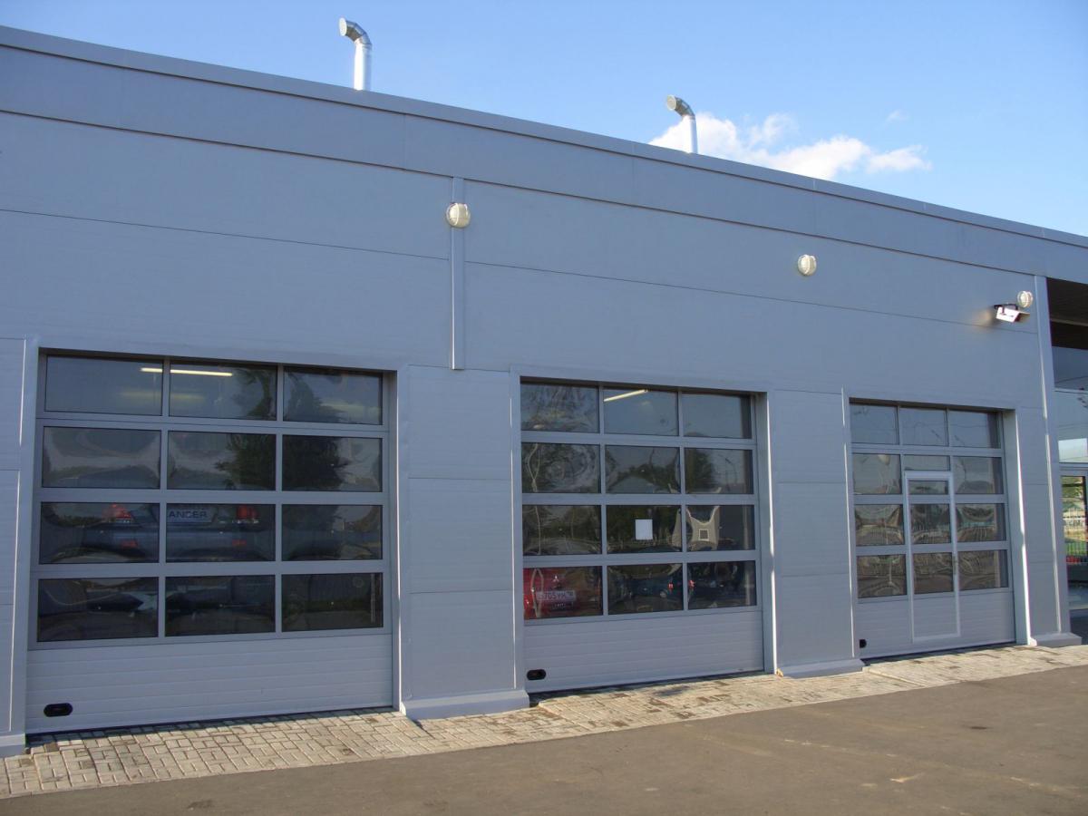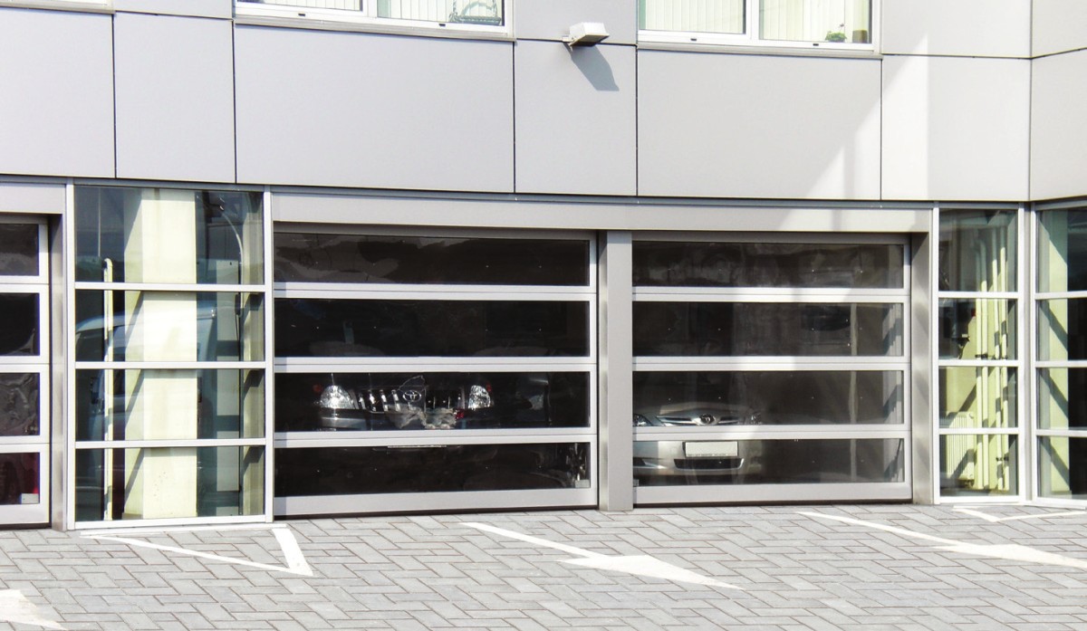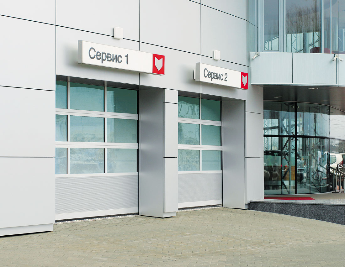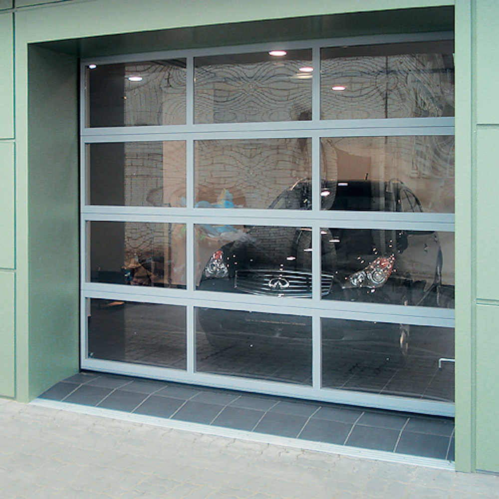 Панорамные секционные ворота устанавливаются в проемы зданий с остекленными фасадами, а так же там, где требуется обеспечить максимальный обзор внутреннего пространства, например, в автосалонах. Панорамные ворота изготавливаются из панорамных панелей, которые собираются из алюминиевых профилей в рамную конструкцию с установленными внутрь стеклопакетами. В качестве остекления панорамных ворот используются устойчивые к механическим воздействиям материалы – поликарбонат, ударопрочный поликарбонат и сотовое оргстекло, которые имеют специальное покрытие, исключающее образование конденсата на панели. Панорамные панели выпускаются в соответствии с нормативно-технической документацией и проходят обязательный контроль.